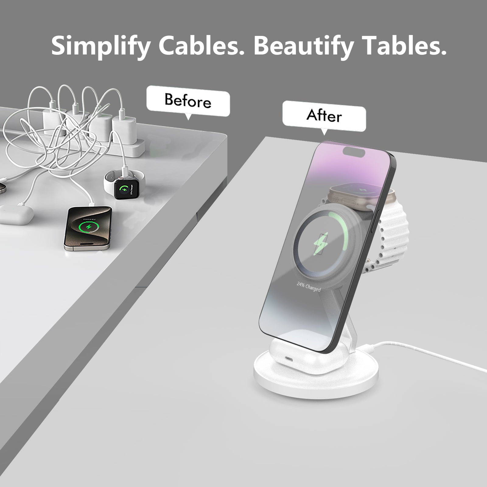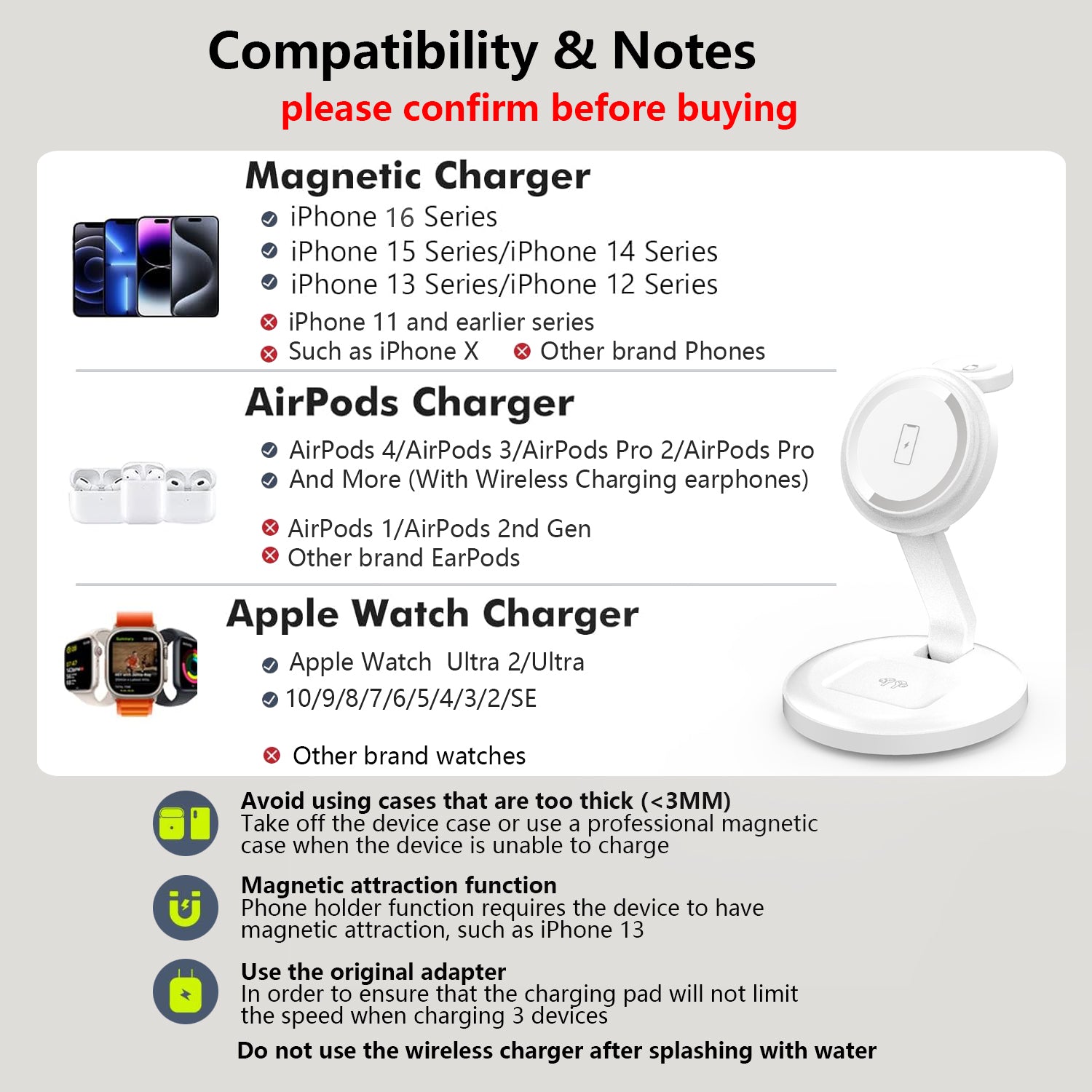 【Wide Compatibility】3 in 1 magnetic wireless charger can charge for iPhone, for iWatch, and for AirPods. Please NOTE that the magnetic wireless charger stand only support for iPhone 17 Pro Max/Air/17/16/15/14/13/12 series,the phone case only supports magnetic cases or no case, for iWatch 10/9/8/7/6/5/4/3/2/SE/Ultra/Ultra 2, for AirPods 2/3/4/Pro/Pro 2(Note:For AirPods 2/3/4 come in 2 versions,make sure to use wireless charging case)Wireless charging station designed for Apple magnetic devices!