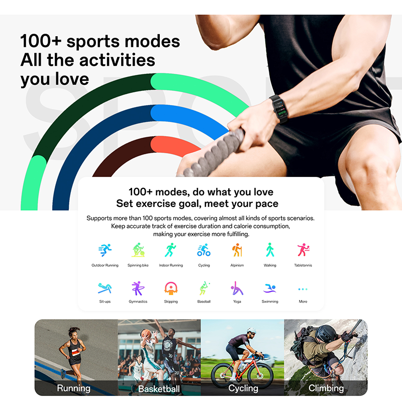 Equipped with over 100 sports modes including walking, running, cycling, yoga, basketball, football, rowing, and more. Users can set exercise goals such as time, distance, or calories for flexible workout tracking.