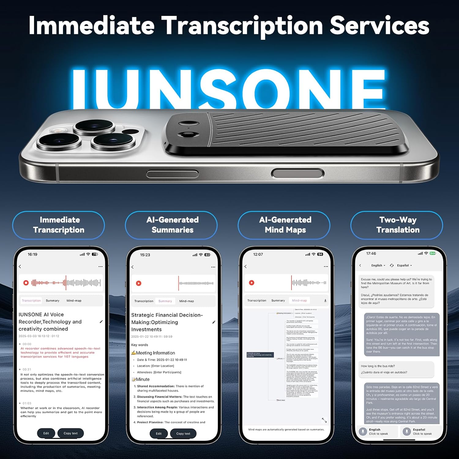 【IUNSONE Intelligent Ecology】Unlock a full suite of smart features through the dedicated app. Enjoy 400 minutes of full functionality per month for free. For extended use, subscribe to a Premium plan (1,800 extra minutes at $69.99/year) or an Unlimited plan ($149.99/year). This AI voice recorder is your all-in-one solution for studies, business, and multilingual communication.