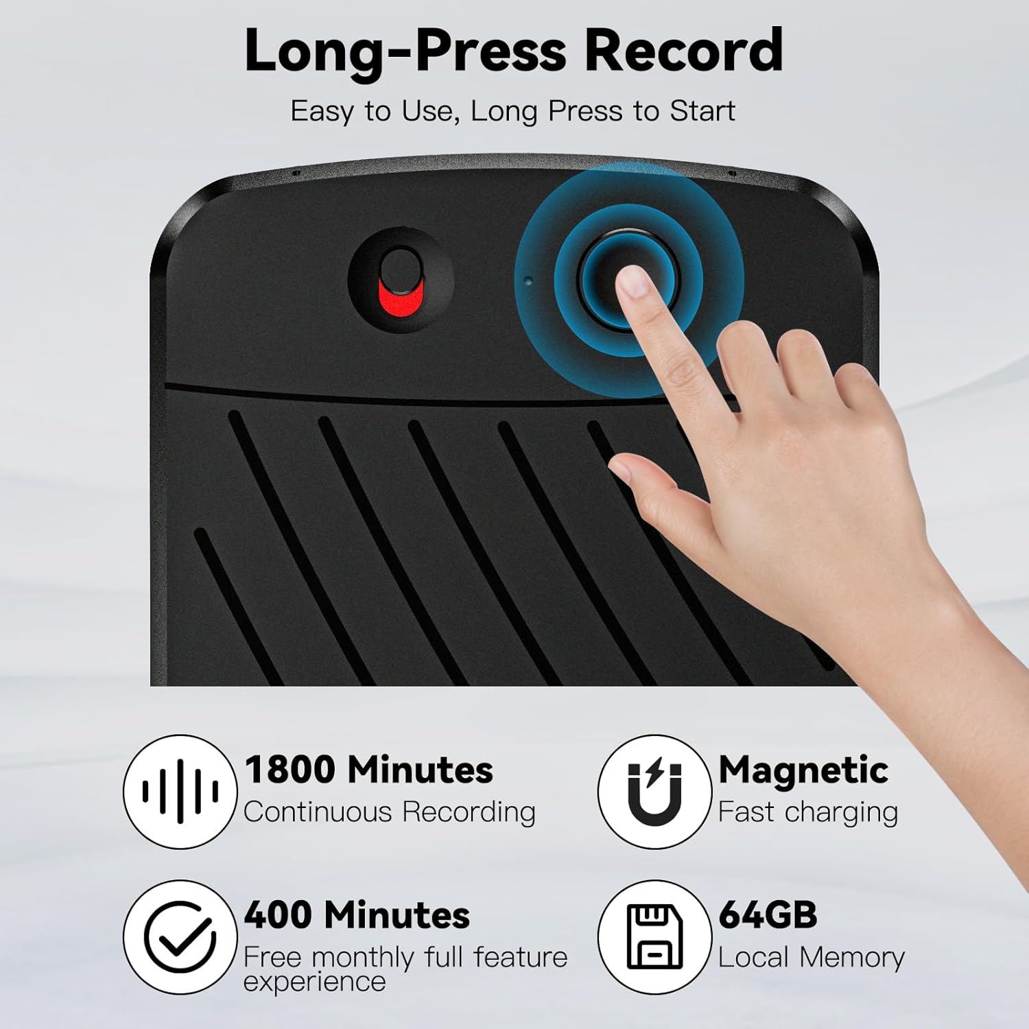 【Lightweight yet Powerful】Designed for life on the go, this AI voice recorder weighs just 1.09 ounces and has a super-slim 0.12-inch profile. With a magnetic function for easy attachment, it provides massive 16GB built-in storage for up to 540 hours of audio and boasts a 30-hour battery life. This portable device can easily handle a full day of meetings, classes, or travel.