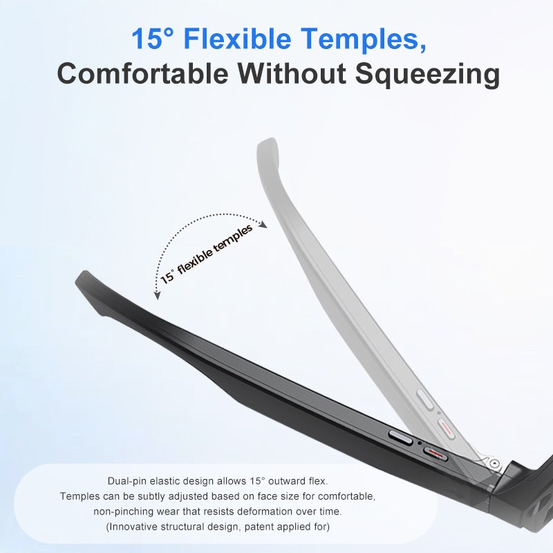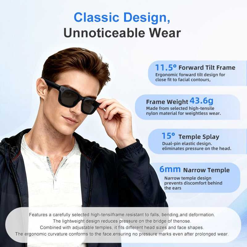 Comfortable Durable Design – Lightweight 54g PC+ABS frame with TAC lenses, LED indicators, dual physical buttons and responsive touch controls. Swipe gestures adjust volume, ergonomic nose pads and ear hooks ensure stable wear, and IPX4 splash resistance suits everyday use. Includes charging case, cable, spare nose pads, ear hooks and user manual.