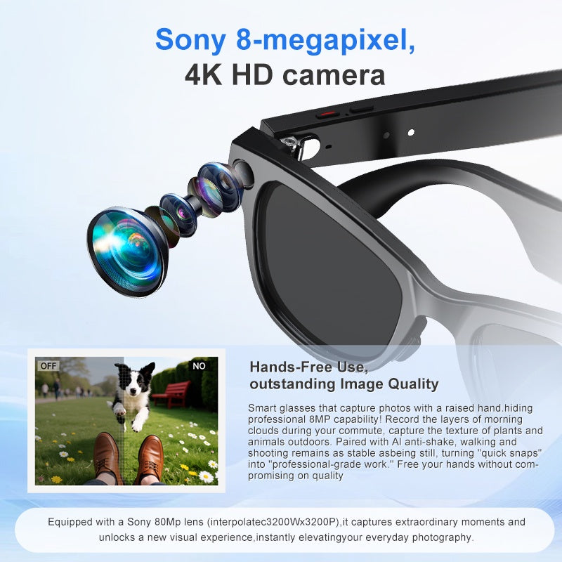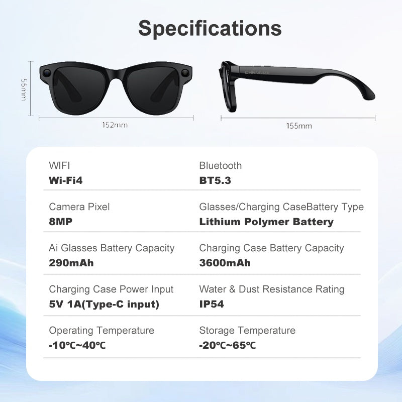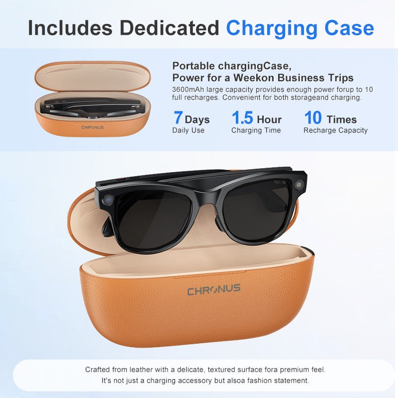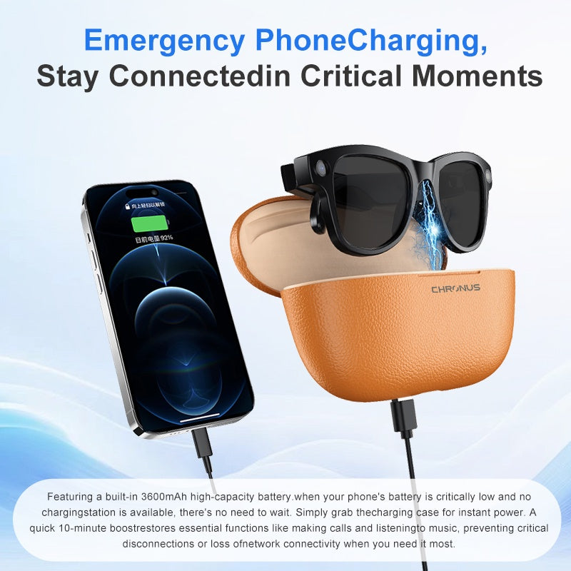 Powerful Charging Case – 290mAh glasses battery supports long playback and recording; the included 3600mAh magnetic Type-C charging case recharges the glasses multiple times and doubles as a power bank for phones. Fast full charge in about 1.5 hours.