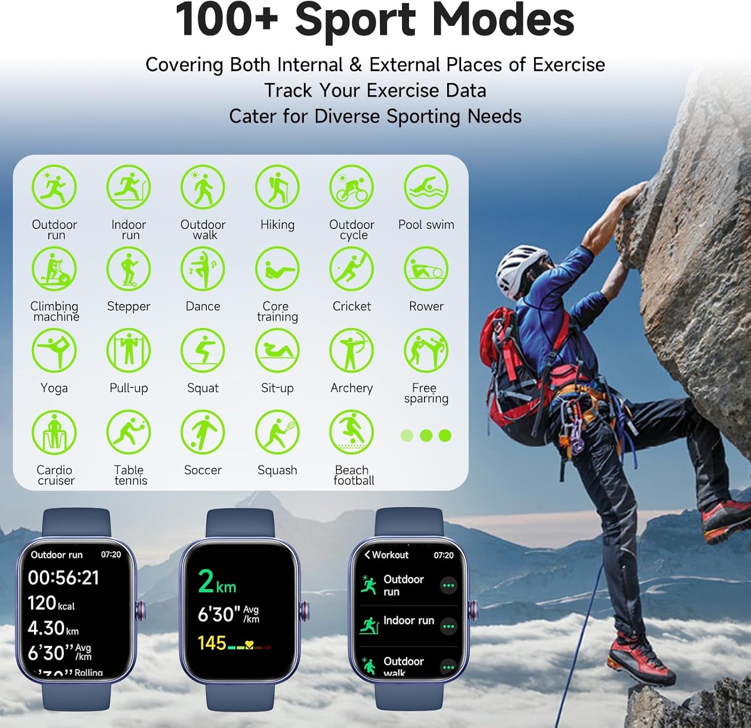 Fitness Partner & Waterproof: Elevate your fitness journey with fitness watch. Track daily steps, distance, and calorie burnt, and support 100 sports modes, including running, cycling, basketball, and Pilates. Generate detailed exercise reports for more scientific train.