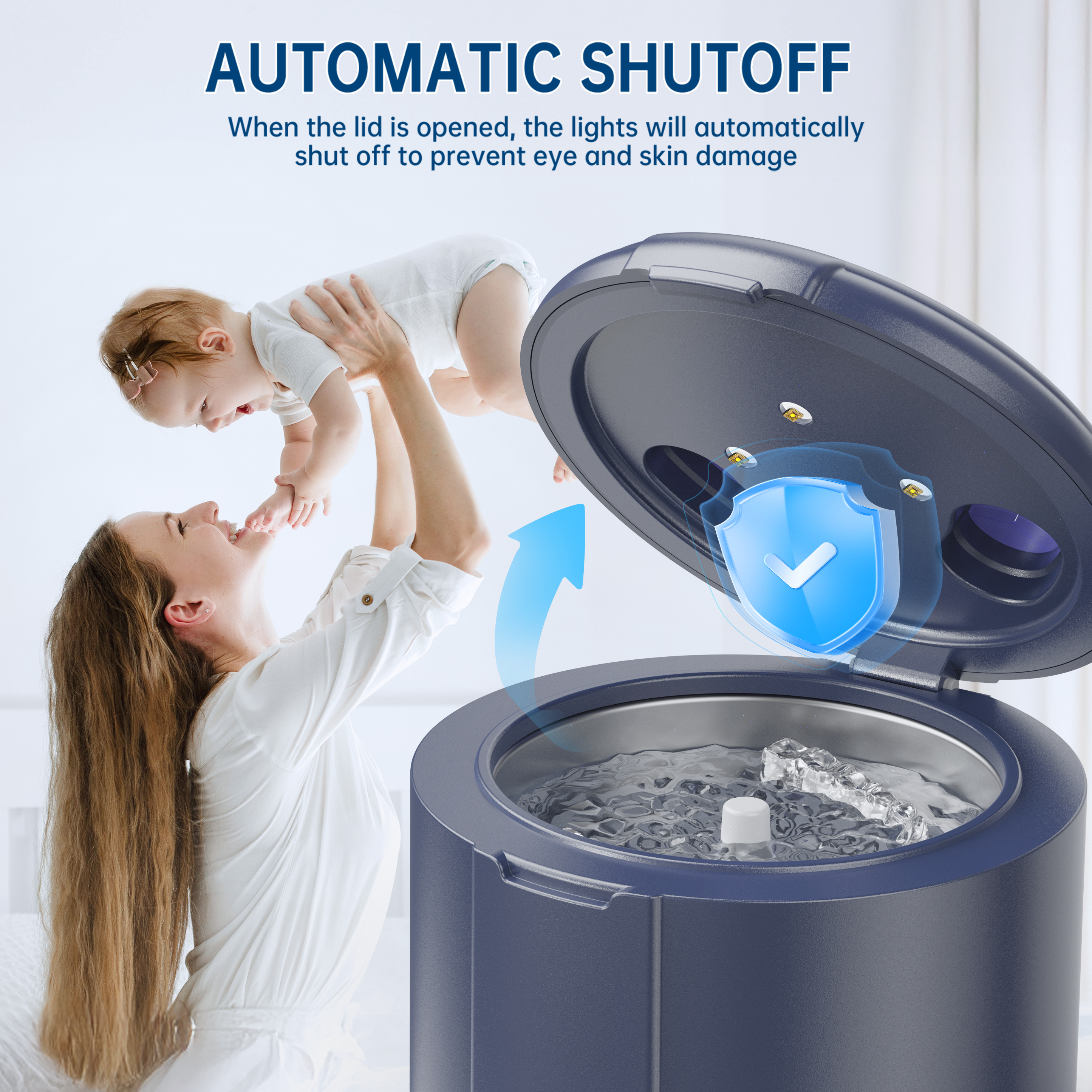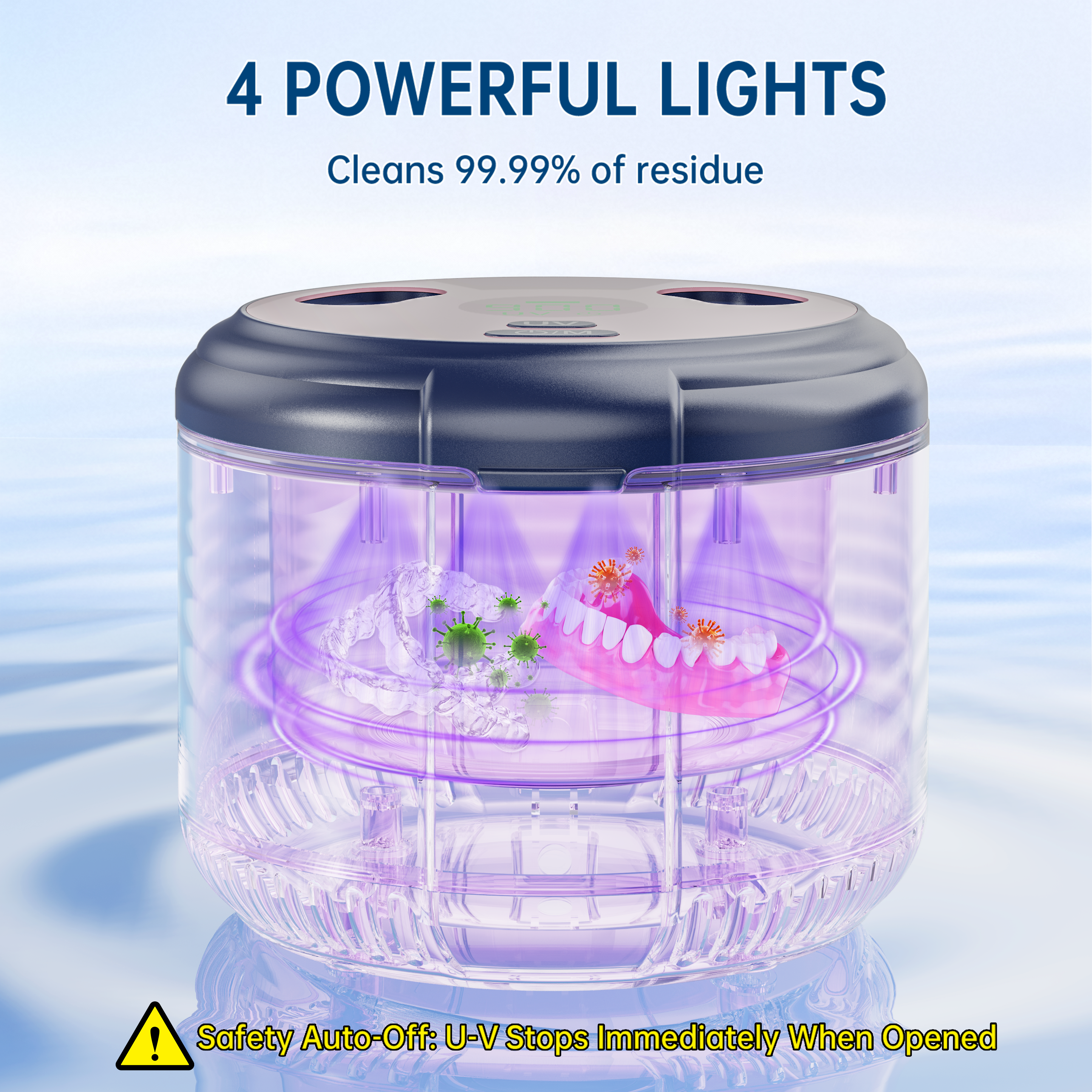 Includes 4 UV light sources to sterilize items during cleaning. The UV lights automatically turn off when the device is running, protecting your skin and eyes from harmful exposure.
