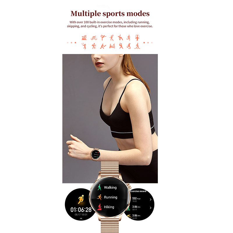 The watch supports 21 activity modes including walking, outdoor running, cycling, fitness bike, yoga, elliptical, basketball, football, badminton, table tennis, rugby, tennis, baseball, jump rope, hiking, long jump, hula hoop, volleyball, golf and sit-ups. It records calories, distance and activity data accurately.