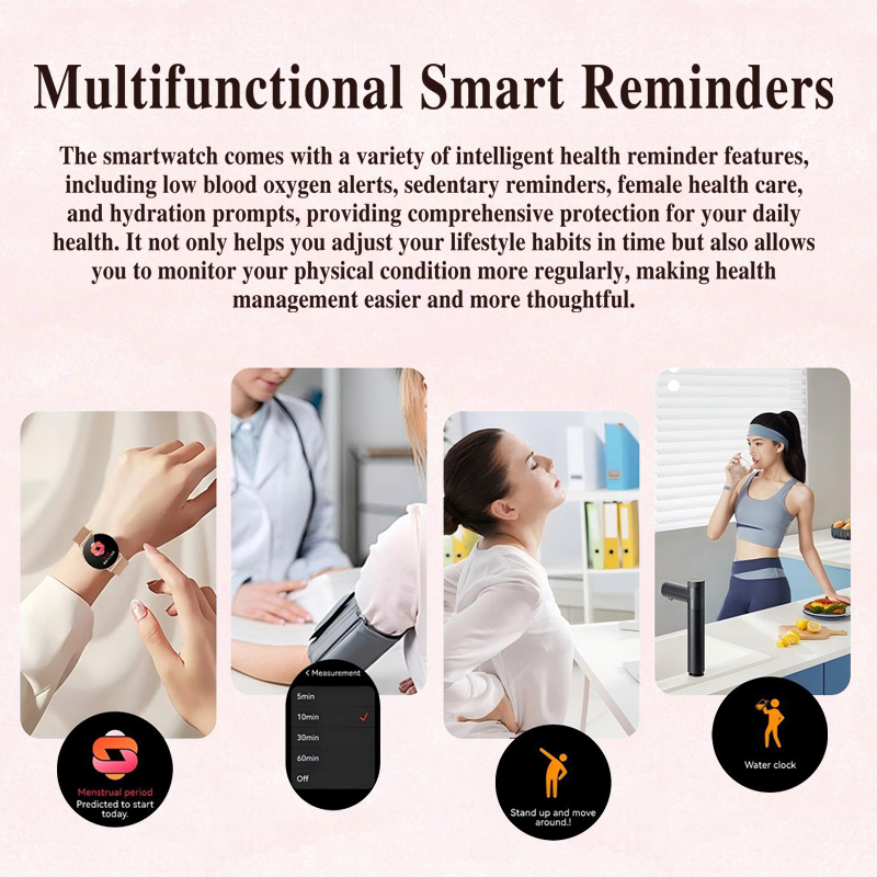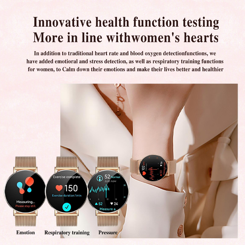 【Care for Women's Health】Smart watch can accurately track the 3 periods of women- menstruation, ovulation and safety periods. It can also set up menstrual reminders in the FitCloudPro mobile app to help women prepare for special days. The smart watch ensures better care for women. Whether it's a birthday or holiday, the women's smartwatch is the perfect gift for women.