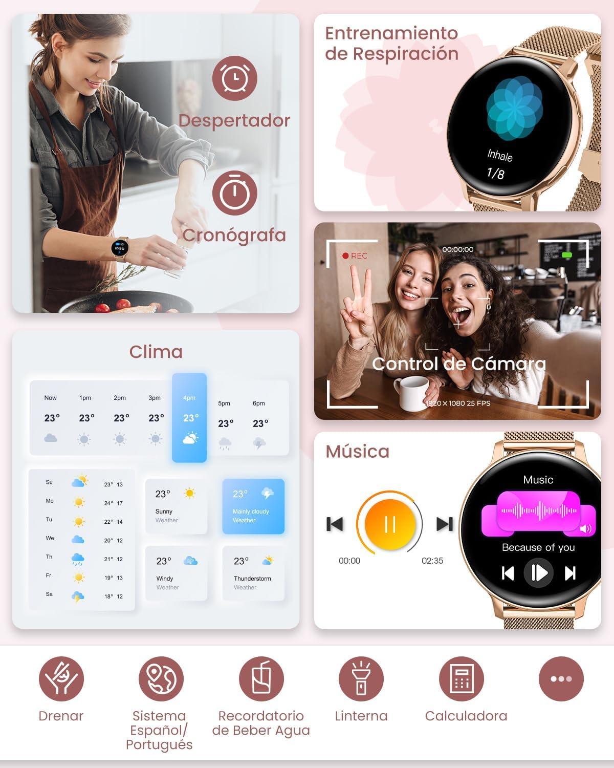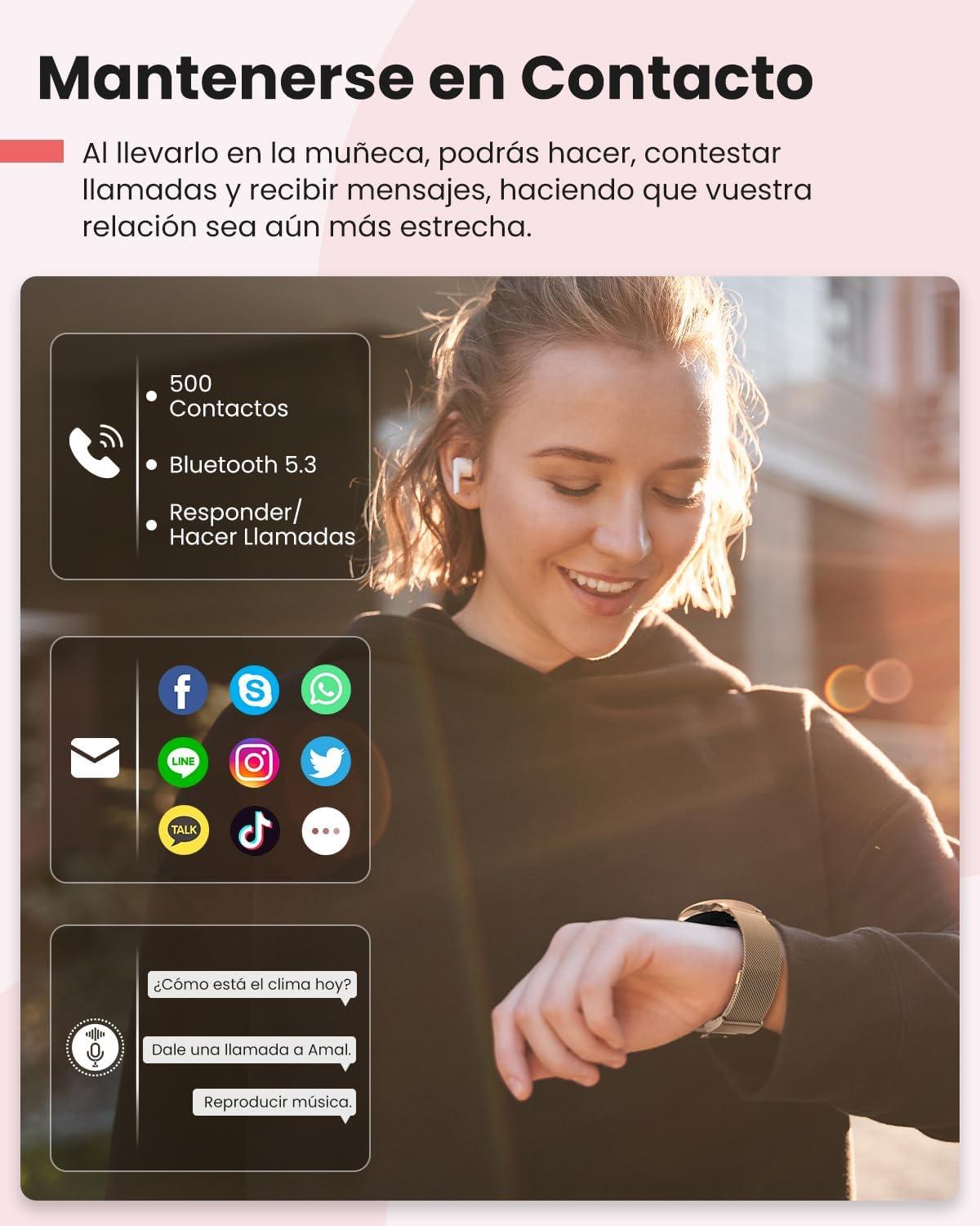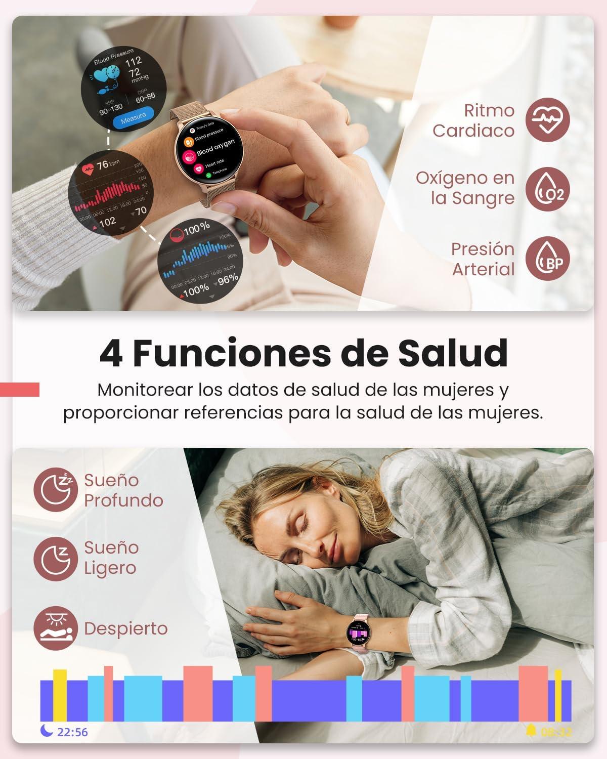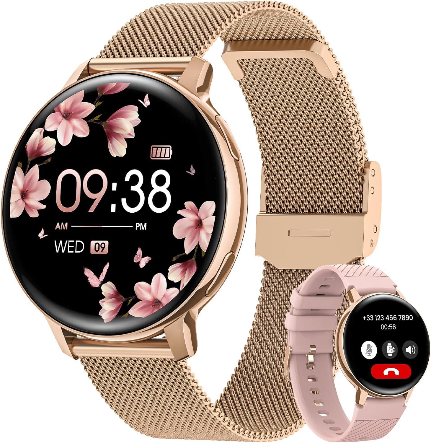 <p>【Fashionable Smart Watch on the Wrist】</p><p>The smart watch has a 1.39-inch touch screen with a resolution of 360*360, providing a smooth touch experience and protecting women's visual health. The lightweight body of only 29 grams can be worn for a long time without any pressure. In addition, it also comes with two straps to choose from: one is a gold steel strap, and the other is a pink silicone strap, allowing you to easily match different styles to show your beauty and personality.</p><p>【Female Health Care】</p><p>This female smart watch accurately tracks three important periods: menstruation, ovulation and periods. Additionally, you can set menstrual reminders on the Pubu Wear mobile app to help women prepare for the special day. Women's smart watches provide better care for women. Whether it's a birthday or a holiday, it's the perfect gift for women.</p><p>【Health Monitoring】</p><p> Equipped with advanced sensors, it can monitor blood oxygen levels, blood pressure and heart rate in real time throughout the day. This smartwatch provides nighttime sleep monitoring to help you improve your sleeping habits. In addition, it also has a breathing training function, which can help you relieve stress easily, help you adjust your lifestyle in time and stay healthy.</p><p>【Always Stay Connected】</p><p>The women's smart watch with call function is equipped with Bluetooth 5.3 and supports storing 500 contacts, making your communication easier. Built-in speaker and microphone ensure clearer calls. The message notification function allows you not to miss any important information, and the AI voice assistant makes your life smarter and more convenient. Compatible with Android 5.1 or higher/iOS 8.0 or higher devices.</p><p>【120+ Exercise Modes】</p><p>Provides more than 120 different exercise modes, giving you a variety of exercise options. You can view routes and workout data through the mobile app. The smartwatch features an IP68 waterproof design and a 300 mAh battery ensuring long-lasting performance. With 5 built-in watch faces, over 200 online watch faces, and customizable watch faces, you can change it to suit your style.</p><p>【Risk-Free Shopping】<br>We offer free returns for any reason. If there is a quality issue, we will replace the product for free. Your satisfaction is our top priority.</p>